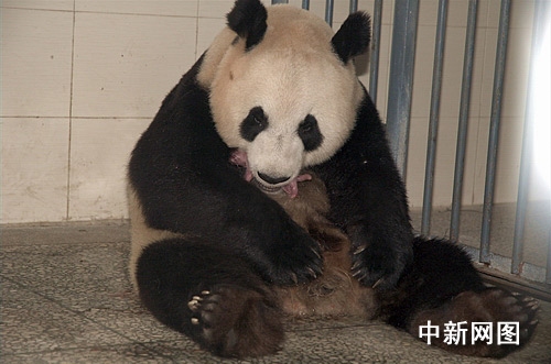 7日晨6點(diǎn)46分,“甜甜”開始出現(xiàn)產(chǎn)前征兆,8點(diǎn)13分破羊水,在經(jīng)過(guò)3個(gè)多小時(shí)的努力后生下一對(duì)健康的雙胞胎。初次當(dāng)媽媽的“甜甜”努力嘗試將寶寶叼在懷里,但小仔亂動(dòng)亂叫,很快又滑落到了地上,經(jīng)過(guò)多次努力,小仔終于在媽媽懷里安靜下來(lái),“甜甜”用舌頭輕舔著寶寶的身體,儼然是位稱職的母親。產(chǎn)下第二仔以后,工作人員隨即將第一仔取出送往育嬰室進(jìn)行人工育幼,經(jīng)初步檢查,該寶寶是雄性,體重146.2克,各項(xiàng)身體指標(biāo)正常。