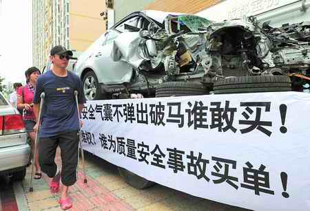 昨日上午,很多途經(jīng)市中心的市民都目睹了一支稀奇的隊(duì)伍:尼桑開(kāi)道,拖車尾隨。拖車上躺著一輛銀色寶馬,車頭右側(cè)受損嚴(yán)重,右前車門扭曲,兩個(gè)前胎都脫離車體。拖車的三面拉著白底黑字的橫幅,上書“寶馬自然爆胎安全氣囊不彈出 破馬誰(shuí)敢買!誰(shuí)為消費(fèi)者維權(quán)!誰(shuí)為質(zhì)量安全事故買單!”等字樣。