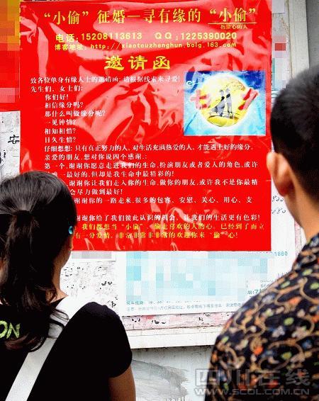 昨(25)日,沙灣路128號小區(qū)門口的告示欄里貼出一張大紅色的“邀請函”:“小偷征婚,征有緣小偷,共度七夕”、“小偷征小偷,生個小小偷。”正當(dāng)圍觀者面露鄙夷時,有眼尖的市民發(fā)現(xiàn),此“小偷”非竊取錢財之輩,“別人是偷心的賊!