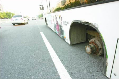 昨天下午,一輛53路空調(diào)公交車行駛時,左后側(cè)兩個車輪突然脫落,導(dǎo)致車身傾斜劃傷路面約20米,所幸沒有造成人員受傷。