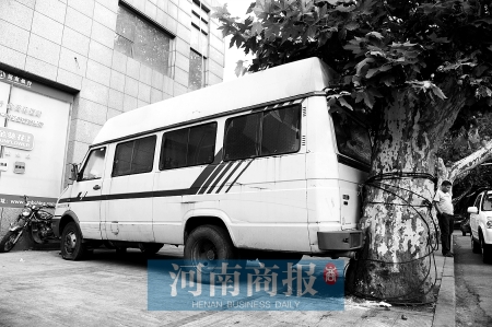 在鄭州市經(jīng)六路與緯三路交叉口附近,這輛白色依維柯車牌號為豫A69026,車頭朝東,距臨街建筑的墻壁大約有一米,車頭與墻之間被人“塞進(jìn)”了一輛三輪車。車尾朝西,緊緊貼住人行道邊的一棵樹。車身擺得很正,剛好把人行道堵死。