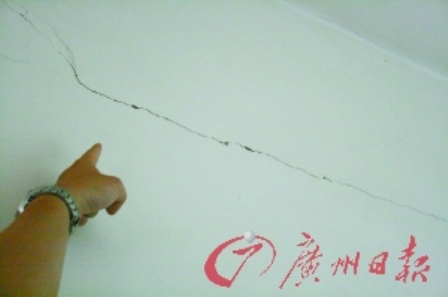昨日上午,記者來到三水大塘蓮塘街三巷。在居民楊女士住房的三樓,記者看到樓道、洗手間、臥室等地多處墻體出現(xiàn)裂縫。有的裂縫寬1厘米左右,部分墻體的批蕩層已開始脫落。