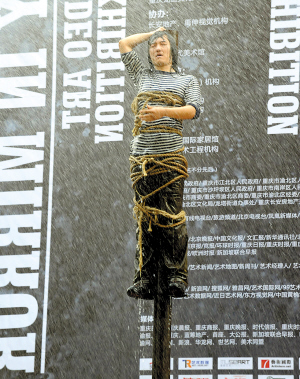 37攝氏度的高溫下,26歲的王軍被綁在近10米高的柱子上,先是被酷熱“折磨”了半小時(shí),后又被環(huán)衛(wèi)車的水龍頭沖淋了半小時(shí),耗費(fèi)了8噸自來(lái)水,總共耗時(shí)兩小時(shí)。這個(gè)名為《守望》的行為藝術(shù)作品昨天下午在黃桷坪102藝術(shù)區(qū)雷倒了不少人!