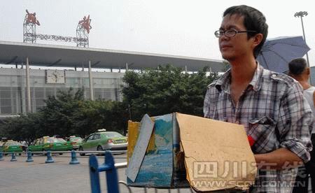 今年20歲的顧明軍來自涼山州會(huì)理縣一個(gè)小村莊,來成都半年,做電工的他沒有找到合適工作,就在一個(gè)小餐館打工。幾天前,家中來電話讓他回家。昨天早上9點(diǎn)半,顧明軍就到了火車北站,準(zhǔn)備買下午1點(diǎn)回老家的車票。買了票,顧明軍看見廣場上圍著一群人。“到底有啥子好看的?”顧明軍撥開人群,發(fā)現(xiàn)樹下躺著一個(gè)紙箱子,箱里有個(gè)盒子,上面有塊紅布!吧蹲?xùn)|西哦?”“骨灰盒,不曉得哪個(gè)掉了的!”“看到就晦氣,哪個(gè)愿意動(dòng)它。”旁邊一位拿著掃帚的大姐說,8日晚上就有人發(fā)現(xiàn)這個(gè)骨灰盒躺在樹下,沒人敢動(dòng)!肮腔液?”顧明軍發(fā)現(xiàn)盒子已經(jīng)被人拆開,周圍粘滿了泥土!疤炷趿耍ナ篮缶谷贿@樣悲慘。”顧明軍走上前去,撿起骨灰盒小心翼翼地放進(jìn)紙箱,并蓋好了蓋子,“人死了,骨灰不能被風(fēng)吹掉!鳖櫭鬈婇_始查看骨灰盒,試圖找到聯(lián)系方式,但除了外包裝上有“歐式別居”4個(gè)手寫的字外,沒有任何線索。