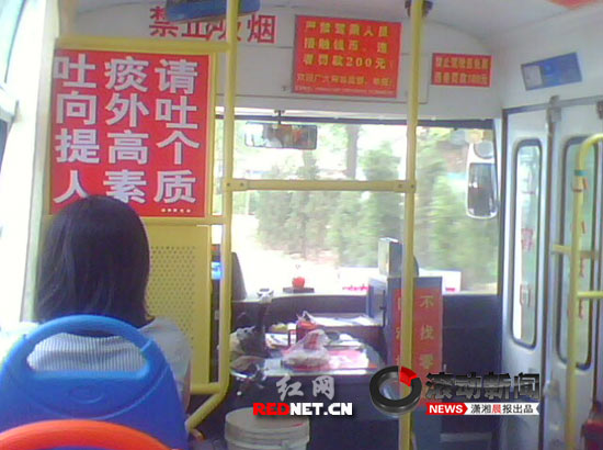 帖中附有多幅圖片,皆拍攝于公交車(chē)前門(mén)靠駕駛室的位置,在司機(jī)臺(tái)后方,有幅標(biāo)語(yǔ)煞是顯眼,紅底,粗體白字,上面寫(xiě)著:吐痰請(qǐng)向外吐,提高個(gè)人素質(zhì)。車(chē)窗前頭有禁止吸煙,嚴(yán)禁駕駛?cè)藛T觸摸錢(qián)幣等標(biāo)語(yǔ),還有特有的黃色鐵桿,座位,都證實(shí)這是一個(gè)標(biāo)準(zhǔn)的公交車(chē),發(fā)帖人稱(chēng)此車(chē)系江蘇宿遷的公交車(chē)。