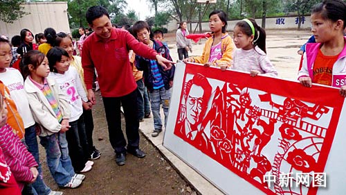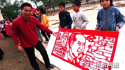 據(jù)了解,該校老師王贊強(qiáng)用一個(gè)月時(shí)間把《東方紅》、《江山多嬌》、《春天的故事》、《走進(jìn)新時(shí)代》等十首紅歌,剪出紅歌剪紙作品,來祝福新中國(guó)60華涎。每張紅歌剪紙用朱紙做原料,長(zhǎng)1.5米,寬0.8米!稏|方紅》剪紙內(nèi)容除毛澤東主席頭像外,還有學(xué)大寨、第一顆衛(wèi)星上天及原子彈爆炸等內(nèi)容!督蕉鄫伞酚泻\濤總書記頭像、奧運(yùn)會(huì)、神六上天等內(nèi)容,每張紅歌剪紙都包含著濃烈的時(shí)代氣息。