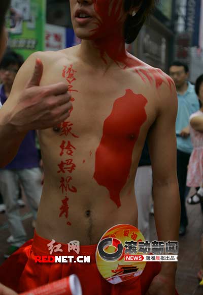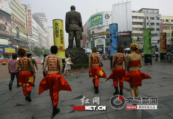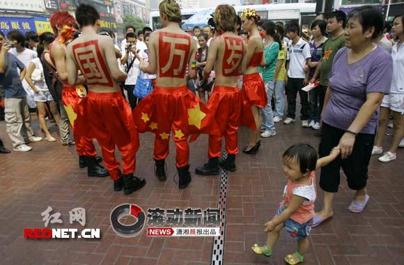 原來(lái),5名自稱(chēng)90后的男女,身上被涂彩繪,發(fā)型怪異,穿著國(guó)旗短褲,背上分別寫(xiě)著“祖國(guó)萬(wàn)歲”四個(gè)字,在這里搞行為藝術(shù)。另外一名妖艷女子,則在給路人發(fā)放紅色傳單。