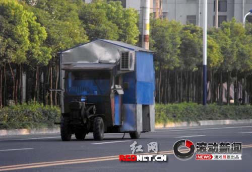 從房車的正面來(lái)看,該房的主體就完全顯露出來(lái)了,車的前部是一輛舊式手扶拖拉車,輪胎、水箱、傳動(dòng)皮帶一應(yīng)俱全;中部是駕駛室主體,跟街頭常見(jiàn)的殘疾車一樣。主要由駕駛室、前面檔風(fēng)玻璃、觀后鏡,一樣都不少,更讓人稱奇的是這輛房車騎駛室頂端(即觀后鏡上方),裝著一臺(tái)空調(diào)掛機(jī)的主機(jī),顯示這臺(tái)房車即便是在炎熱的夏天,也依然能照常使用。房車后部則是主體部分,鋁合金制的車廂、三角形車頂、兩個(gè)后輪,構(gòu)成一輛移動(dòng)的房車。