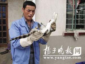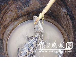 昨天上午,記者接到市民董先生的報(bào)料來(lái)到了江寧谷里孝義村111號(hào),周?chē)?guó)喜正蹲在一個(gè)大缸前,旁邊還有幾位村民在指指點(diǎn)點(diǎn)。記者走近一看,只見(jiàn)一只長(zhǎng)約80厘米的小鱷魚(yú)正在缸底,頭部往上翹,尾部不停地甩動(dòng),看上去很緊張。盡管這條小鱷魚(yú)給周?chē)?guó)喜帶來(lái)了不小的損失,可他沒(méi)有絲毫的恨意,反倒細(xì)心照顧起來(lái)!斑@個(gè)魚(yú)塘我一直在養(yǎng)魚(yú),每年2月份和6月份都投放一次魚(yú)苗,總共1萬(wàn)多條,鳊魚(yú)、鯽魚(yú)都有!敝?chē)?guó)喜說(shuō),可讓他奇怪的是,產(chǎn)量都不高。周?chē)?guó)喜曾研究過(guò)多次,可沒(méi)有任何結(jié)果,這讓他百思不得其解。可就在今年8月份的時(shí)候,周?chē)?guó)喜在清理魚(yú)塘?xí)r,突然發(fā)現(xiàn)一只小怪物伸出了頭,嘴巴長(zhǎng)又尖!熬褪撬,我當(dāng)時(shí)確定魚(yú)塘產(chǎn)量不高就是因?yàn)檫@只小怪獸!敝?chē)?guó)喜告訴記者,他自此開(kāi)始盯著魚(yú)塘,可小怪獸很警惕,大都在魚(yú)塘底,很難發(fā)現(xiàn)。功夫不負(fù)有心人,通過(guò)近半個(gè)月的觀察,周?chē)?guó)喜發(fā)現(xiàn)小怪獸喜歡上岸睡覺(jué),不過(guò)是在對(duì)岸的水花生上面,很難捕捉!拔舶秃荛L(zhǎng),嘴很尖,身上顏色黃黑相間!敝?chē)?guó)喜說(shuō)第一眼看到小怪獸就覺(jué)得像是鱷魚(yú),不過(guò)他不敢確認(rèn),于是喊來(lái)了弟弟,結(jié)果弟弟覺(jué)得像是國(guó)家一級(jí)保護(hù)動(dòng)物揚(yáng)子鱷。