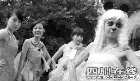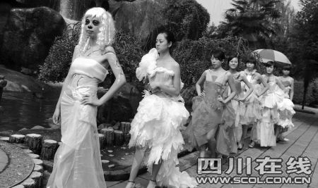 活動(dòng)現(xiàn)場(chǎng),七八名大學(xué)生美女志愿者身穿五顏六色,用紙袋、塑料袋、筷子和孔雀羽毛等奇異材料制成的服裝為游客們獻(xiàn)上了一場(chǎng)別出心裁的時(shí)裝秀,向每一位游客宣傳環(huán)保理念。據(jù)了解,這些紙裝是武漢一高校服裝設(shè)計(jì)專業(yè)的學(xué)生精心制作的,他們希望和成都的同學(xué)共同呼吁市民愛(ài)護(hù)環(huán)境。來(lái)自武
