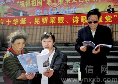 “黨!偉大的黨,60華誕的今天,我為您歌頌不朽的贊歌寫下您愛(ài)民的詩(shī)篇……”鄧成友的朗誦吸引了不少男女老少駐足傾聽(tīng)。