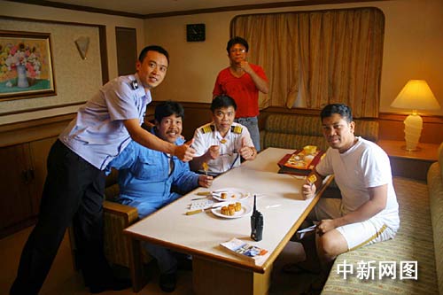 “趕快讓大家都過來,有月餅吃。”船長告訴助手,十幾個船員陸陸續(xù)續(xù)來到船長辦公室,狹小的船艙一下子熱鬧起來!癎ive me one.”(給我一塊。)“It’s delicious.”(真好吃。)