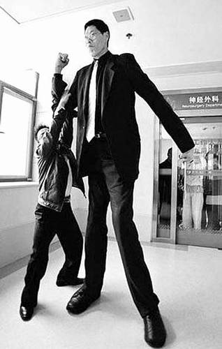 今年27歲的趙亮是濮陽南樂縣梁村鄉(xiāng)西崇町村人,身高2.46米,這一高度比姚明高20厘米、比曾有“世界第一巨人”之稱的鮑喜順還高出10厘米,是名副其實(shí)的“第一高人”。趙亮16歲時身高就已達(dá)到1.90米,17歲時被推薦到河南省體;@球隊(duì),在一次扣籃時左腳扭傷,一直未能痊愈。今年4月,天津一家醫(yī)院免費(fèi)為趙亮進(jìn)行了腳傷手術(shù)。不久,成為媒體關(guān)注焦點(diǎn)的趙亮被歐寶地板聘請,成為公司一名管理人員。上班后,趙亮作為企業(yè)形象大使備受社會關(guān)注。