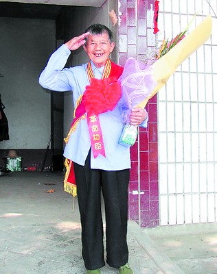 昨日,記者在民政部?jī)?yōu)撫安置局制訂的新中國(guó)成立60周年觀禮名單上看到,在49個(gè)人中,湖南就有兩人!傲硪晃皇且骊(yáng)市離休老干部、二級(jí)傷殘軍人姚杰生……不過(guò),我是這49人中年齡最大的一個(gè)!睆埨献院赖卣f(shuō)。