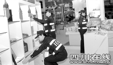 昨晚10點(diǎn),新會(huì)展中心各展館里一片忙碌。在一群正在安檢的帥氣黑衣特警中間,3個(gè)扎著發(fā)髻的女特警格外引人注目。除負(fù)責(zé)現(xiàn)場指揮的教導(dǎo)員吳虹外,28歲的羅蕾正用伸縮臂鏡檢測著一食品展臺(tái)頭頂?shù)闹樱衲陝側(cè)刖闹苋,則彎腰在一排展柜前仔細(xì)檢查著。和男特警一樣,她們都穿著帥氣的黑色警服,戴著警帽,不施粉黛,右胸前印有“成都特警”4個(gè)大字的閃光背心,將她們襯得格外颯爽。