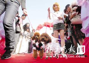 昨天,兩只身穿結(jié)婚禮服的寵物狗正在領(lǐng)取結(jié)婚證。當(dāng)天,南京首屆寵物集體婚禮在南京綠博園內(nèi)舉行。15對寵物狗“新人”伴隨著婚禮進行曲逐對踏上紅地毯。狗狗們不但領(lǐng)取到寵物結(jié)婚證書,還互相贈送了愛情信物。據(jù)悉,寵物集體婚禮在南京尚屬首次,別開生面的婚禮現(xiàn)場吸引了不少市民前來捧場。圖為一對可愛的泰迪犬夫妻領(lǐng)到了結(jié)婚證。 (周曼 宋嶠)