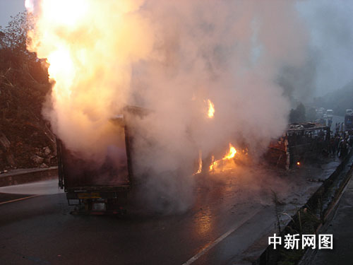 由于集裝箱上滿載約十八噸的膠水和家俱,碰撞后很快起火,大客車與運(yùn)礦大貨車亦不能幸免。南丹消防官兵接警趕至?xí)r,發(fā)現(xiàn)現(xiàn)場火光沖天成了火海,其中集裝箱大卡車正猛烈燃燒,而大客車和運(yùn)礦大貨車不久后也被燒成廢鐵。消防官兵隨后出動(dòng)水槍滅火,四輛消防水車頻繁往返縣城運(yùn)水達(dá)二十多車次。救援工作至十八日下午六時(shí)許才結(jié)束。
