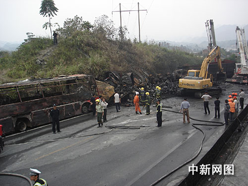 中新網(wǎng)南寧十月十八日電 (王剛 王越川)十八日凌晨三時(shí)許,廣西南丹縣境內(nèi)發(fā)生四車相撞慘烈事故,造成包括大客車在內(nèi)的三輛大型車輛被燒毀,至少十五人受傷,其中三人重傷。