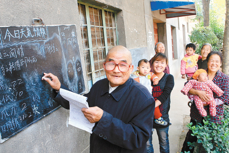 從2001年3月14日開始,他做了一塊小黑板掛在自家小商店前,把當(dāng)天的天氣預(yù)報寫在上面。夏秋農(nóng)忙時,早上7點半,下午5點,他一天要出兩期天氣預(yù)報,兩次“更新”內(nèi)容,讓村民們在第一時間看到最新的天氣預(yù)報。除此之外,老人還會在黑板上寫上根據(jù)天氣變化增減衣服等溫馨提示。村民們出門前常常在這塊小黑板前停下腳步,誰要走親戚,看到黑板上預(yù)報當(dāng)天有雨,就趕緊回家拿上雨具,再加件衣服……這塊小黑板成了村民的好幫手!安还芄物L(fēng)下雨,還是逢年過節(jié),這黑板上的天氣預(yù)報肯定是最新的內(nèi)容!”村民王師傅說。