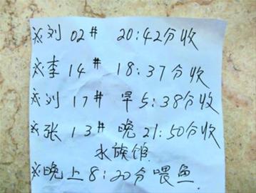 由于年齡大了,記不住那么多時間,于是每星期日兒子返校前就會給于女士寫一張時間表,里面有收菜的時間、喂魚食的時間、還有上別的同學(xué)地里偷菜的時間,以方便于女士操作。