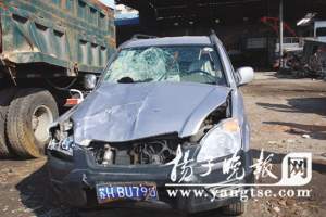 昨天上午在停車場,記者見到了肇事車輛:牌照為蘇HBU790雙環(huán)越野車,前擋風(fēng)玻璃半邊差不多被撞碎,上面還有一個大洞,直徑為49厘米,并且從碎裂的玻璃縫隙中提取了數(shù)根頭發(fā)。從車內(nèi)名片盒內(nèi),記者找到一張杜軍本人的名片,上面寫有“志圣科技(廣州)有限公司蘇中地區(qū)經(jīng)銷部工程師”字樣。據(jù)楚州區(qū)公安局交警大隊辦公室主任朱士能介紹,昨天上午杜軍血檢結(jié)果顯示,他屬于醉酒駕車,應(yīng)負(fù)事故全責(zé)。警方同時已安排人員到杜軍家讓他們盡快先拿出10萬元來做死者家人的安撫工作。一名不愿透露姓名的民警告訴記者,從事故發(fā)生時間以及杜軍的血檢結(jié)果來看,杜軍應(yīng)該是中午喝的酒。他同時告訴記者,該車在事故發(fā)生前還有一起闖紅燈,兩起違停行為。
