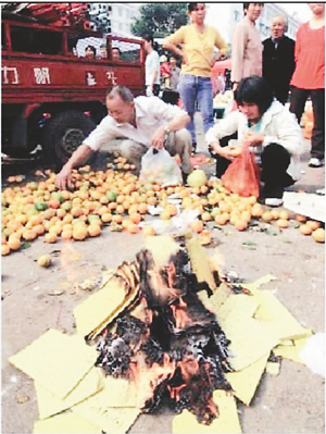 李謀輝的家人急于準(zhǔn)備安葬老人的后事,把沒有賣掉的2輛三輪車上的柑橘、蘋果等水果作2毛錢一斤低價處理,吸引許多群眾搶購。圍觀的群眾看到這么便宜的水果,加上主人心思不在這上面,開始哄搶。有的人給了一兩元錢,更多的人則是看到?jīng)]有人問要錢,拿起水果就走人。半個小時,連買帶拿,大約700多公斤水果被一掃而空。