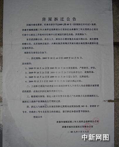 在10月16日由承德市城鎮(zhèn)面貌三年大變樣總指揮部辦公室以及承德市房屋拆遷辦公室印發(fā)的《房屋拆遷公告》明確顯示:10月16日至10月20日為老行政中心房屋產(chǎn)權(quán)調(diào)查摸底、產(chǎn)權(quán)核實(shí)、評估階段,并由“承德市三年大變樣辦公室舊行政中心拆遷工作組”實(shí)施拆遷。而金源公司于10月18日就開始強(qiáng)行拆除皇家安裝工程公司辦公用房。