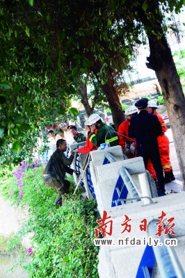 昨天(4日)上午,廣州體育學院一名學生抓到一名偷電腦的小偷,不料小偷在被押往警務室的途中,掙脫保安跳入沙河涌并躲進排污口兩個多小時。據(jù)抓獲小偷的保安介紹,小偷跳入河中后,路過的同學見了,紛紛拿東西砸向小偷,小偷叫囂道:“再砸就把你們宿舍偷光!”