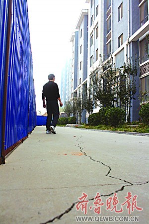 在施工工地的影響下,10號樓北側(cè)路面中央,一條長約10米、寬近1厘米的裂縫清晰可見。3單元樓道口門內(nèi)側(cè),也出現(xiàn)了一道明顯的裂縫,就因為這道裂縫,樓道門曾一度無法閉嚴(yán)!澳銇砜,樓外也有一圈裂縫!庇浾咴谝幻糁敢拢吹揭粯峭鈮εc地面接合處裂開了一條很寬的縫隙,最寬處有兩厘米。