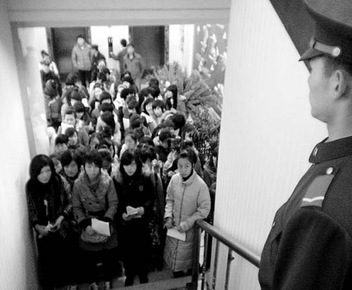 當(dāng)記者進(jìn)入鴻翔賓館一樓大廳時,前來報名的女孩和家長們將這里擠得水泄不通。在賓館二樓,沈陽警備區(qū)的工作人員正在做著準(zhǔn)備工作。“報名開始后,我們將進(jìn)行分類,在校大學(xué)生將走一個門報名,應(yīng)屆畢業(yè)生將走另一個門!