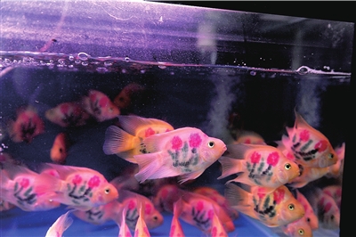 記者走訪了位于高碑店附近的幾個水族區(qū),發(fā)現(xiàn)都有這種文身魚出售。這種魚有成人手掌大小,魚身上刻有玫瑰花和各種寓意發(fā)財吉祥的圖案。文身魚主要有兩個品種,一種叫“鸚鵡”的紅黃色熱帶魚,另一種是有著兩條長長胡須的白色“招財魚”。