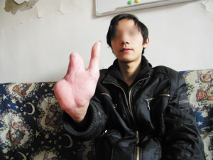 “我當時疼極了!看到自己的4根手指已經(jīng)沒了,我心里特別害怕!”在這條生產(chǎn)線上工作的,都是小東的親屬。事發(fā)后,在舅姥爺?shù)膸ьI(lǐng)下,親屬們緊急將小東送到附近醫(yī)院。公司老板此時也得知了情況,并讓小東親屬將其轉(zhuǎn)到天津醫(yī)院進行治療。在搶救期間,小東的親屬將找到的四根手指帶到了醫(yī)院。但因為手指已碎,而且粘上了很多橡膠,已經(jīng)無法進行再植手術(shù)了。住院十余日后,小東出院了?粗皇O掳雮手掌的右手,小東多次掉下眼淚。