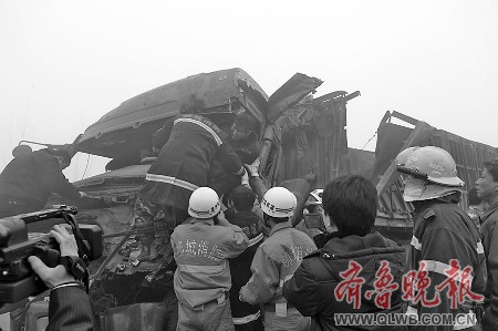 據(jù)消防隊(duì)員介紹,大霧致使京福高速公路上發(fā)生多起車禍,他們?cè)诂F(xiàn)場(chǎng)共救出4人,其中2人死亡,2人受傷。