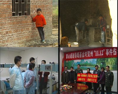 再來看看看這盤空炮筒,很難想像當別的同齡人在學習和玩耍的時候,楊會村的十幾個小孩卻擠在楊萬文家的小屋子里,一個一個往爆竹上插引信。在經(jīng)濟不發(fā)達的賀州農(nóng)村,一天一塊多錢的工錢對幾歲十幾歲大的孩子來說挺有誘惑力的。不過,他們卻為此付出了血的代價,F(xiàn)在爆炸事故中受傷的孩子分別被安置在賀州、桂林、南寧的三家醫(yī)院。他們的傷情如何?是否能度過危險期?我們的記者趕到了桂林市181醫(yī)院。
