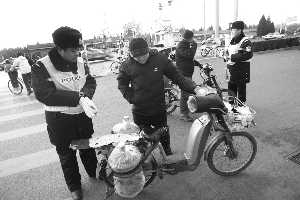 昨日下午,天壇東門路口。一輛闖紅燈的電動自行車騎車人被交警攔下時,交了20元罰款。5分鐘內(nèi),天壇東門路口接連攔下三輛電動自行車,另兩人均因違法載物———車上綁有大個桶裝水,受到20元罰款處罰。其中一人表示,剛知道電動自行車不得載人載物。