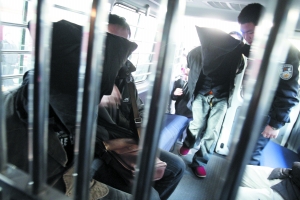 昨日,21名戴著手銬、蒙著頭套的電信詐騙案嫌疑人被押解回京。9月24日上午,昌平市民許某接到謊稱是上海市公安局和上海市銀監(jiān)會(huì)工作人員的電話,他們稱事主電話欠費(fèi),被牽扯進(jìn)一起國(guó)際金融犯罪,許某分兩次將85萬(wàn)轉(zhuǎn)賬到騙子的賬戶。許某報(bào)警后,偵查員最終在西安將臺(tái)灣人劉茂安等21人控制。目前,21人均被刑事拘留。本報(bào)記者 周曉東 攝