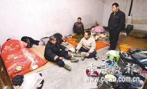 工人關(guān)洪云說(shuō),大家以為在11月工程完工后就能結(jié)算工錢回家,都沒(méi)有準(zhǔn)備在重慶過(guò)冬的衣物和鋪蓋。天寒地凍,工人們晚上睡覺(jué)不敢脫衣服。65歲的老工人朱云正感冒了,冷得瑟瑟發(fā)抖,由于沒(méi)錢治病,只能硬扛著。好心的工友們將兩床厚被子蓋在他的身上取暖,但他依然冷得發(fā)抖。
