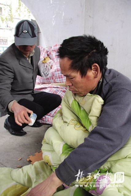 記者隨后來到“大傻”所睡的位置,發(fā)現(xiàn)這位綽號(hào)“大傻”的民工并沒有睡著,見到記者也是兩眼迷茫,后來他告訴記者,自己名叫王震學(xué),今年46歲,安徽阜陽(yáng)人,父母過世,只剩下自己孤身一人在外打工求生活,由于腿疼、肺部也有毛病,所以干不了重活,20天前得了重感冒,一直以來發(fā)燒不止,后來是一位在附近賣烤紅薯的老師傅給他買了一瓶安乃近。和王震學(xué)睡在一起的小湯說,王震學(xué)已經(jīng)20多天沒有起過床,這幾天也是基本吃不下飯,我真怕再不將他送進(jìn)醫(yī)院,他也只有等死了。