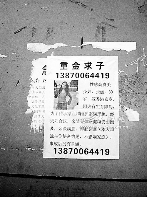 沒費(fèi)多少時(shí)間,記者便在某臨街店面的外墻上看到了這則廣告,內(nèi)容為“性感高貴美少婦,張麗,30歲,嫁香港富商,因夫有生育障礙,為了傳承家業(yè)和維護(hù)家族形象,經(jīng)夫婦合議,來(lái)陸尋誠(chéng)意健康男士圓夢(mèng),親談滿意,即赴你處(本人單獨(dú)與你秘密約見,不影響家庭),事成后另有重謝”,廣告上還配有一張美女全身照,更是吸引了不少市民的眼球。圍觀市民為此議論紛紛,有的說可能是真的,現(xiàn)如今無(wú)奇不有;還有的說,這種事怎么可能廣而告之,肯定是騙子設(shè)的圈套。