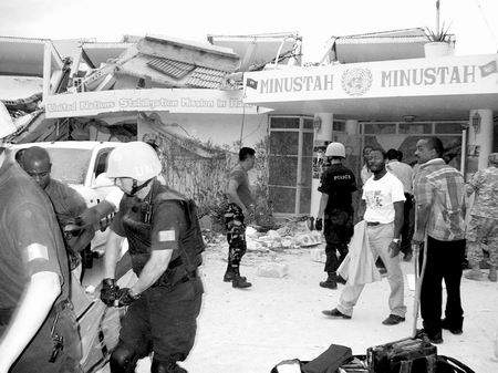 海地時間1月12日下午4時50分,太子港發(fā)生地震時,于江樺和在太子港工作的中國同事劉昆開車前往聯(lián)海團總部大樓接一位美國同事。車子在大樓前還沒停穩(wěn),大家就覺得車子在晃,一樓已經(jīng)冒出大量白色灰塵并伴隨著轟鳴聲,于江樺和劉昆下車后趕緊向遠離大樓的地方跑。由于地面在震顫,根本無法站立,倆人只好蹲下等地震停止。大約30秒鐘后,于江樺和劉昆轉(zhuǎn)過頭來,看到聯(lián)海團總部大樓已經(jīng)完全坍塌。于江樺連忙掏出手機撥打隊長趙化宇的手機,但此時信號已經(jīng)中斷。這時防暴隊長說:“我們的代表團正在樓里開會!甭牭竭@個消息后,于江樺的頭一下子就蒙了。