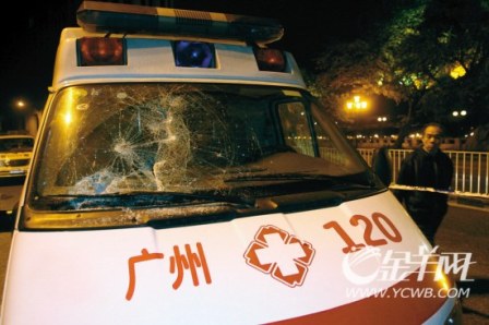 記者接報趕到現(xiàn)場,在沿江西路中山大學(xué)附屬第二醫(yī)院大門前,一輛車身噴有“廣州紫荊醫(yī)院”字樣的救護車停在路邊,車頭的擋風(fēng)玻璃和右前門玻璃被砸爛,地上還留有砸車用的磚塊。紫荊醫(yī)院司機李先生雖然沒有被打傷,但是情緒還很激動。他告訴記者,他們接到電話稱,有病人需要救護車轉(zhuǎn)送茂名,救護車在中山二院門口剛停下來,“前后各一臺越野車便把救護車夾住,車上沖下來十多人,有人手上還拿著砍刀。”