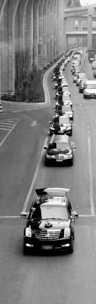 中午12點,這個婚車隊又出現(xiàn)在了穿金路上。一輛凱迪拉克越野車排在車隊最前方,負責開道和攝像。新郎、新娘乘坐的加長林肯緊隨其后,7輛奔馳S350和1輛奔馳320行駛在車隊靠前方陣,7輛寶馬X5和3輛凱迪拉克位于車隊中間,3輛保時捷卡宴押后。這些車輛除兩輛為重慶牌照、一輛為廣州牌照外,其余車輛均掛著昆明本地車輛號牌。車內(nèi)的人不時搖下車窗,幾乎所有車輛上的司機和乘客都是年輕人,其中不乏剃著光頭的時尚潮人。