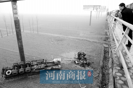 昨日凌晨5時(shí)許,黃河大橋上一公里內(nèi),一輛煤車、一輛貨車和一輛油罐車分別沖斷護(hù)欄墜入橋下。據(jù)民警介紹,事故原因疑是橋面結(jié)薄冰導(dǎo)致路面濕滑所致。