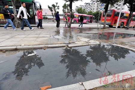 昨天下午,記者在現(xiàn)場看到,水坑大約有十幾平方米,隱隱有酸臭味撲面而來。“這幾天剛下過雨,氣味已經(jīng)好了很多!睒I(yè)主周先生 說,年前氣溫高的那兩三天,臭味能熏到三四十米開外的樓層,許多住戶大熱天不敢開窗。記者注意到,這個水坑正好位于108公交車的終點站,距離站牌不過三四米。因此,附近居民等車時,不得不挨著水坑,碰到上下班高峰期,常有人被擠到坑里,弄得一身酸臭。