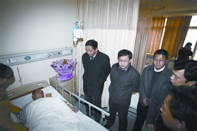 大年初二,在連續(xù)工作近一個月后,37歲的江漢區(qū)城管執(zhí)法大隊直屬六中隊隊員劉漢橋突發(fā)腦溢血。昨日(21日)下午,江漢區(qū)委書記張平、區(qū)長李強(qiáng)來到協(xié)和醫(yī)院,看望了劉漢橋及妻子,并送去鮮花、慰問金和營養(yǎng)品。