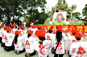 宣誓完畢,活動進入高潮,“老板們”后退一步,轉(zhuǎn)過身來面對著雷鋒畫像,齊齊雙膝跪地,以表示“對雷鋒精神的虔誠和最高敬意”,然后起立對畫像三鞠躬。隨后,這些人又向路人散發(fā)活動的紅色文化帽和文化衫,以號召更多人“向雷鋒同志學(xué)習(xí)”,把雷鋒精神轉(zhuǎn)化為自己的“心靈財富”。