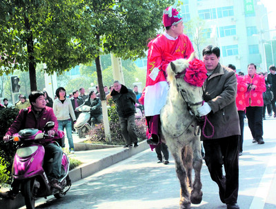 新郎周先生和新娘肖小姐都是80后人,對于中國古典文化頗為癡迷。在勾勒自己的婚禮時,在國外留學(xué)多年的肖小姐希望能像中國古典小說中描述的一樣,新郎騎馬前導(dǎo),新娘花轎及嫁妝后隨,鑼鼓鞭炮迎至男家。