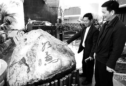 昨日,記者在白鷺洲天鵝賓館附近看到了這塊翡翠原石。其重量約2.6噸,外形酷似蝙蝠,切面部分還加刻了“如意”二字。
