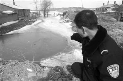 25日14時(shí)許,記者來(lái)到位于依蘭縣宏克力鎮(zhèn)東北方向的三義村,在村前路口轉(zhuǎn)彎處,記者見(jiàn)到一個(gè)寬約10米,長(zhǎng)約40余米的條狀大坑,這里就是三個(gè)孩子出事的地方。此時(shí)的大坑水面上仍結(jié)著冰,但部分冰面已經(jīng)破碎,水面上還冒著熱氣。大坑周?chē)呀?jīng)圍上了繩索,一塊木板警示牌上面寫(xiě)著“此處水深危險(xiǎn)”,紅色的油漆還沒(méi)有干。附近的居民告訴記者,這塊木牌和攔坑的繩索都是今天早晨才設(shè)立的。