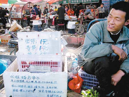 昨日下午,在位于南關(guān)路立交橋下,與寶雞市路燈管理處相對(duì)的攤位前,記者見到了正在賣菜的余東陽。短發(fā)、濃眉、皮膚黝黑,笑容有點(diǎn)像《天下無賊》里的“傻根”,小伙子看上去的確像菜攤旁他的征婚啟事上介紹的那樣,“很普通,也不帥”,但一周來,他已經(jīng)成了周圍菜販和很多買菜市民津津樂道的話題人物。